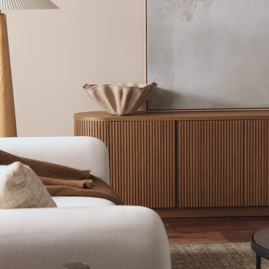 Crafted from solid desert oak and veneer, with a pedestal base, rounded sides, and linear fluting, this sideboard exudes mid-century style. The interior and shelves are fully finished, offering quality detailing both inside and out.