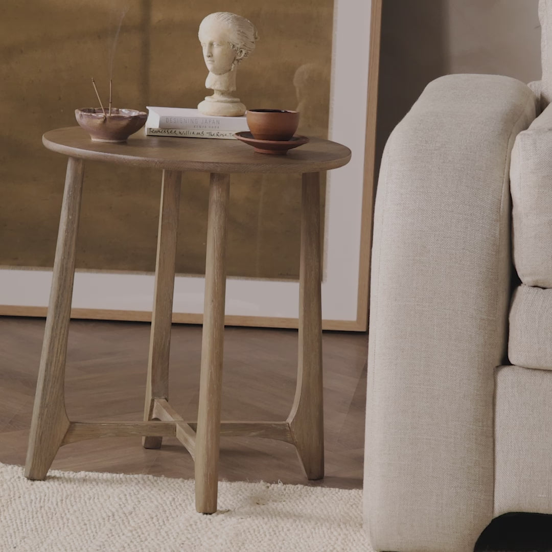 A simple oak table with a light, warm finish and subtle details on the legs for a handcrafted touch. Perfectly sized to keep your book or drink within easy reach, in any space or style.