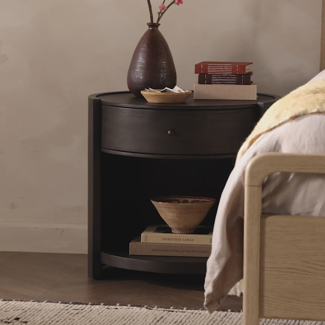 Des contours riches apportent du caractère à la chambre. Une table ronde en chêne finition noire offre un casier spacieux et un tiroir unique avec glissières métalliques et poignée en bronze.