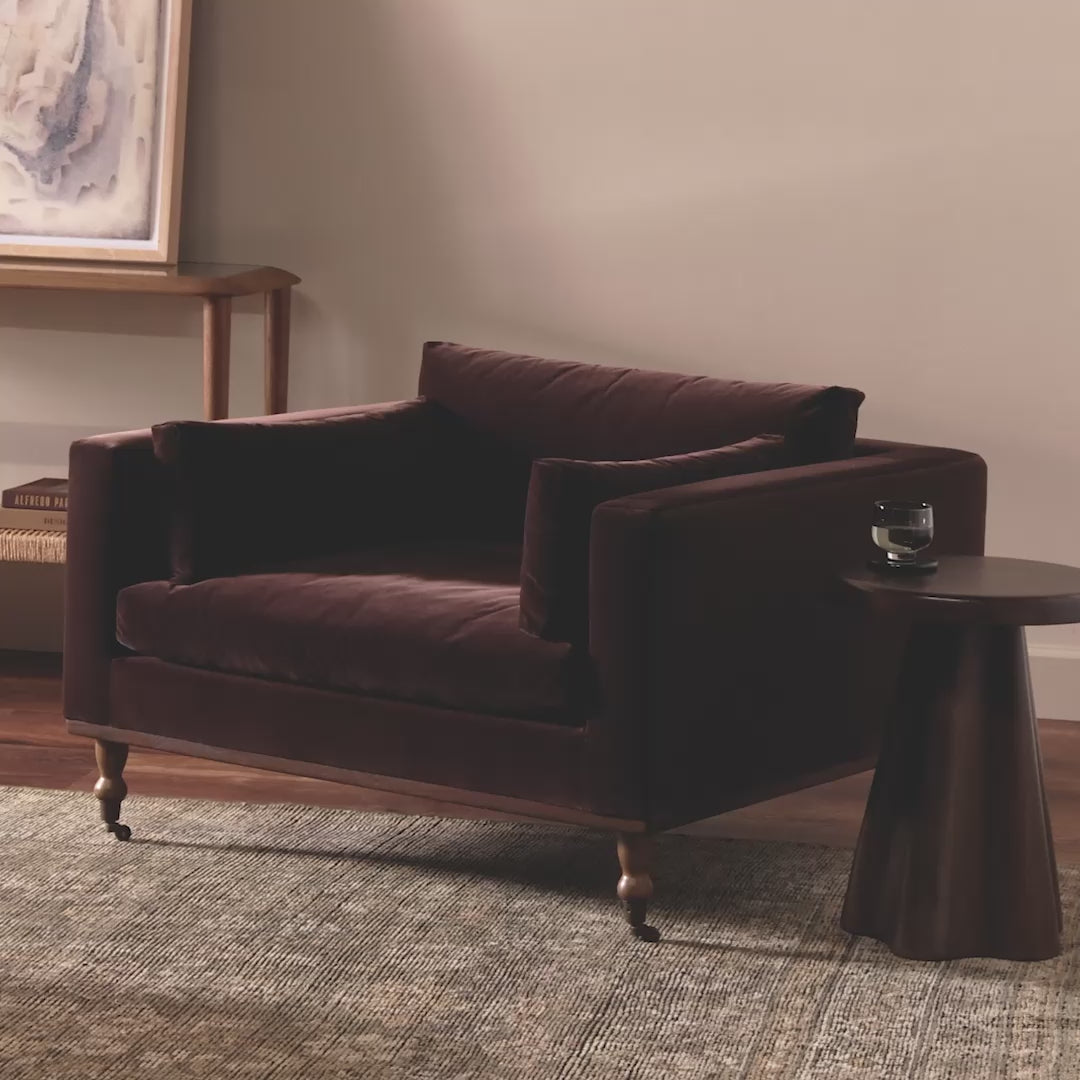 Avec des détails traditionnels tels que des pieds en chêne tourné et des roulettes en laiton, cette chaise d’appoint basse présente une assise longue pour un confort accueillant. Le revêtement en velours brun chocolat habille un dossier à arête vive et des coussins d’accoudoirs carrés.