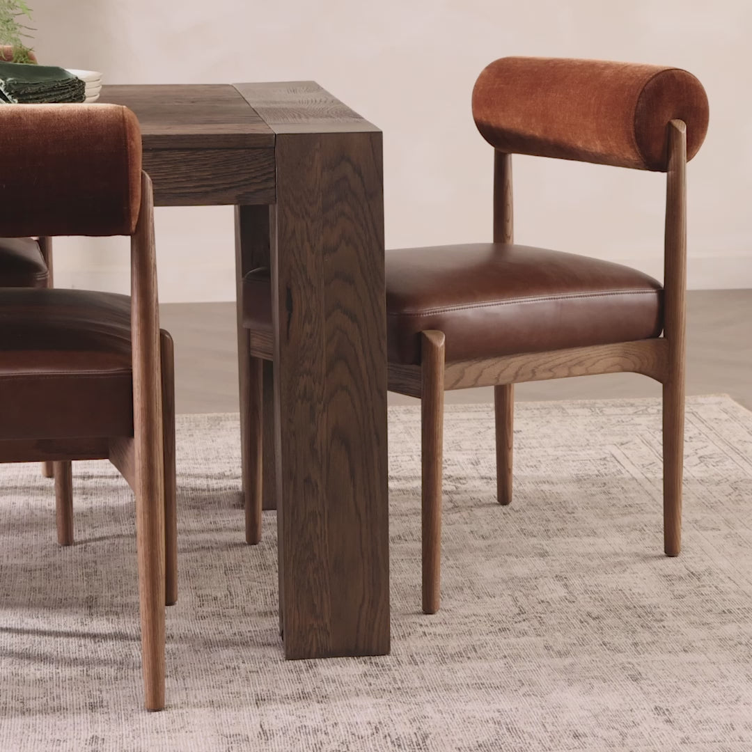 Découvrez une chaise de salle à manger qui allie élégance intemporelle et caractère distinctif. Son dossier cylindrique rembourré et sa structure en chêne massif offrent confort et stabilité, tandis que l'association raffinée de cuir pleine fleur et tissu brun crée une texture riche inspirée du design des années 70. Une pièce polyvalente qui transforme votre espace repas avec subtilité et style.