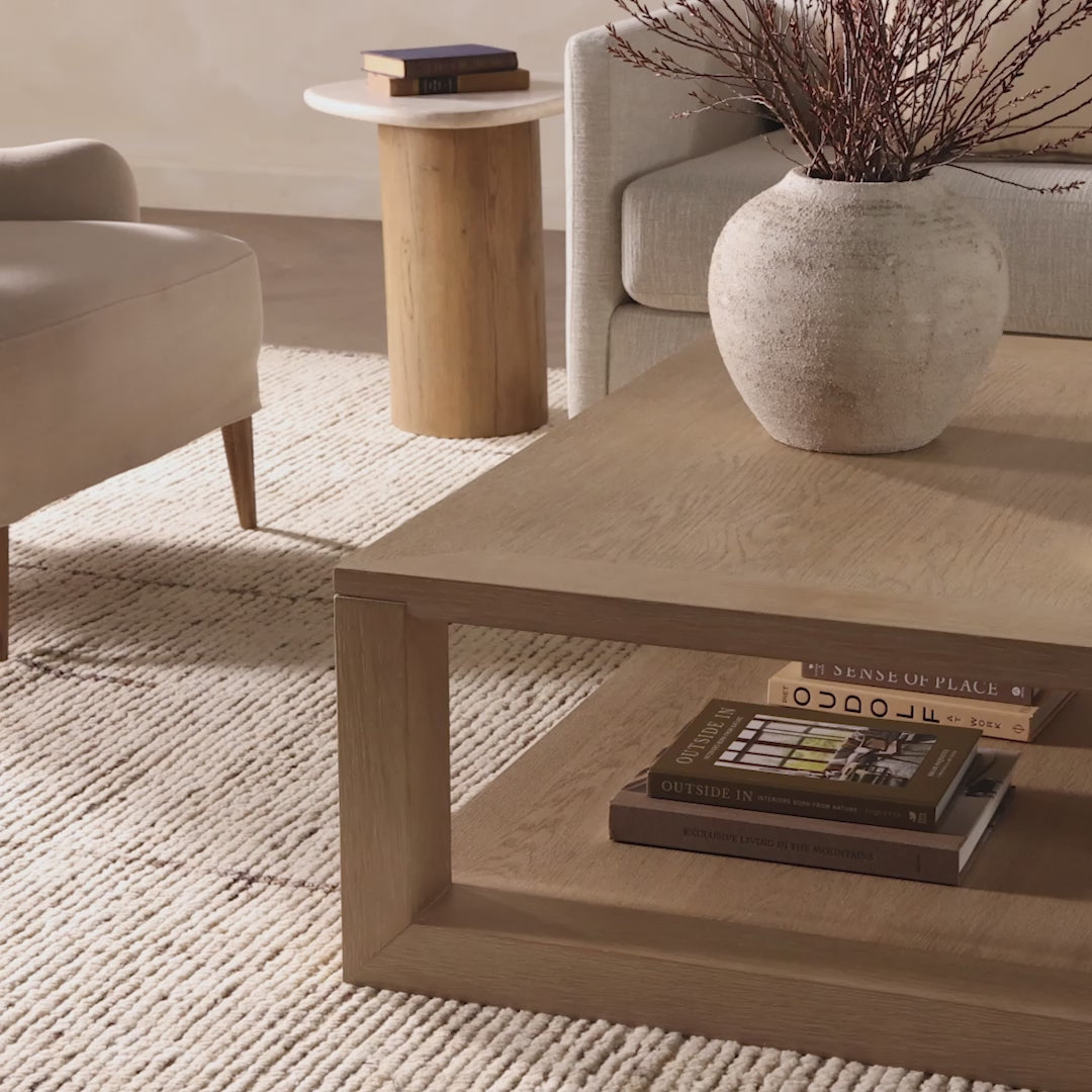 Confectionnée en chêne massif blanchi, cette simple table basse carrée apporte un look léger et épuré à votre salon. Les étagères inférieures offrent un espace supplémentaire pour le rangement et la présentation de vos livres favoris et plus encore.